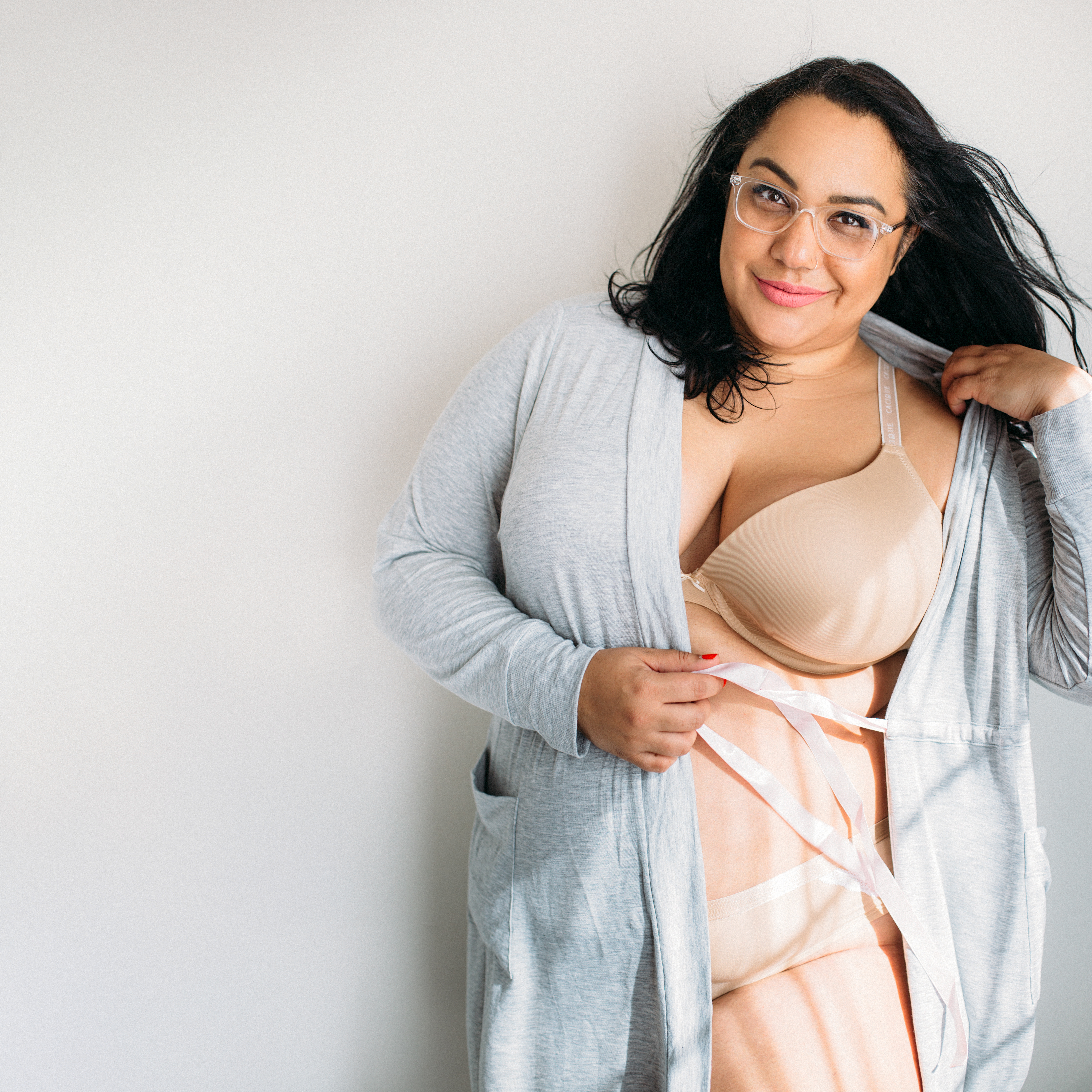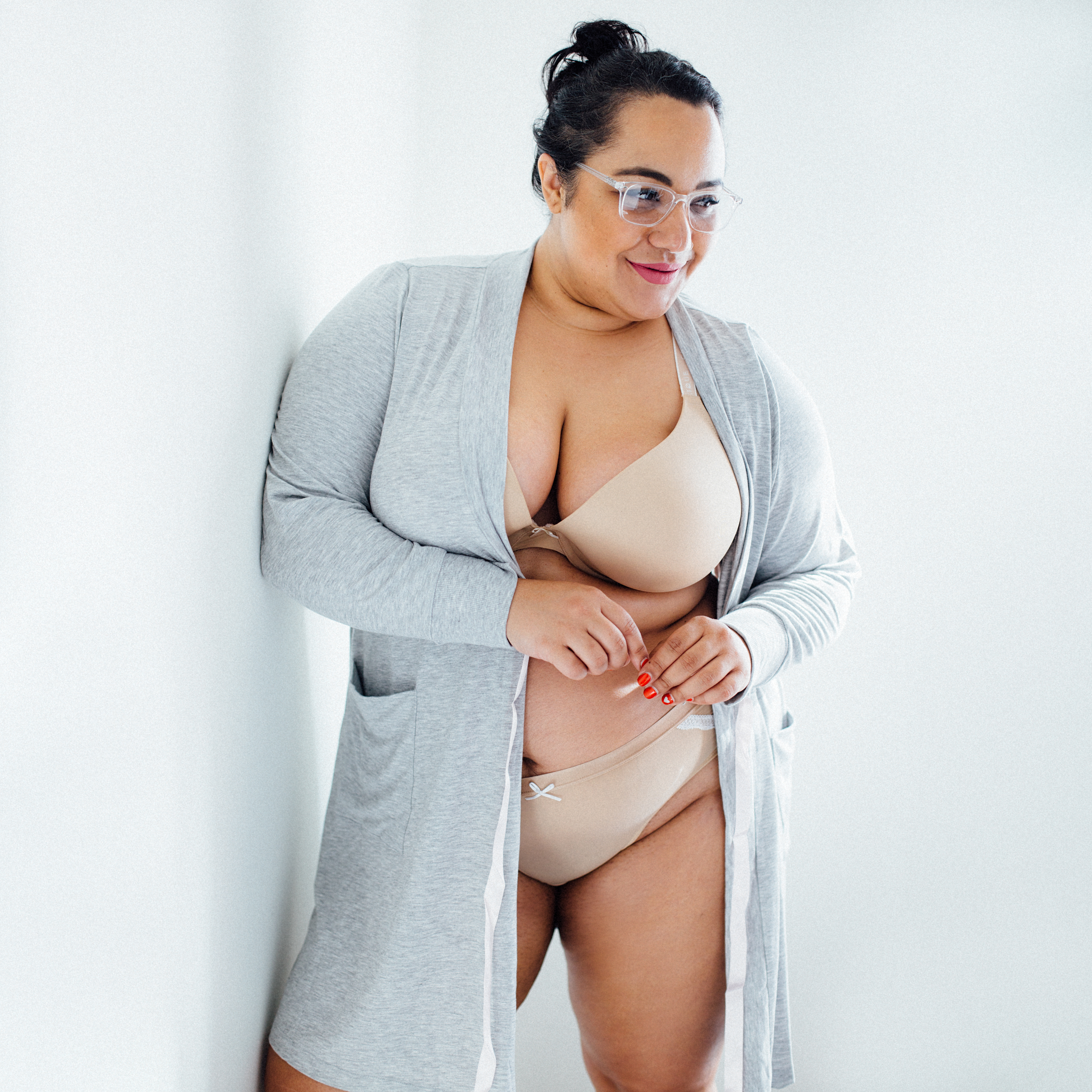 Another part of my self-care practice is treating myself to things that genuinely make me feel good. This includes comfortable, quality undergarments like the Cacique ‘So Light Boost Plunge Bra,’ their Extra Soft Cheeky Panty (both in ‘Cafe Mocha’) and this French Terry Sleep Robe (in Heather Gray) that I’m wearing here.