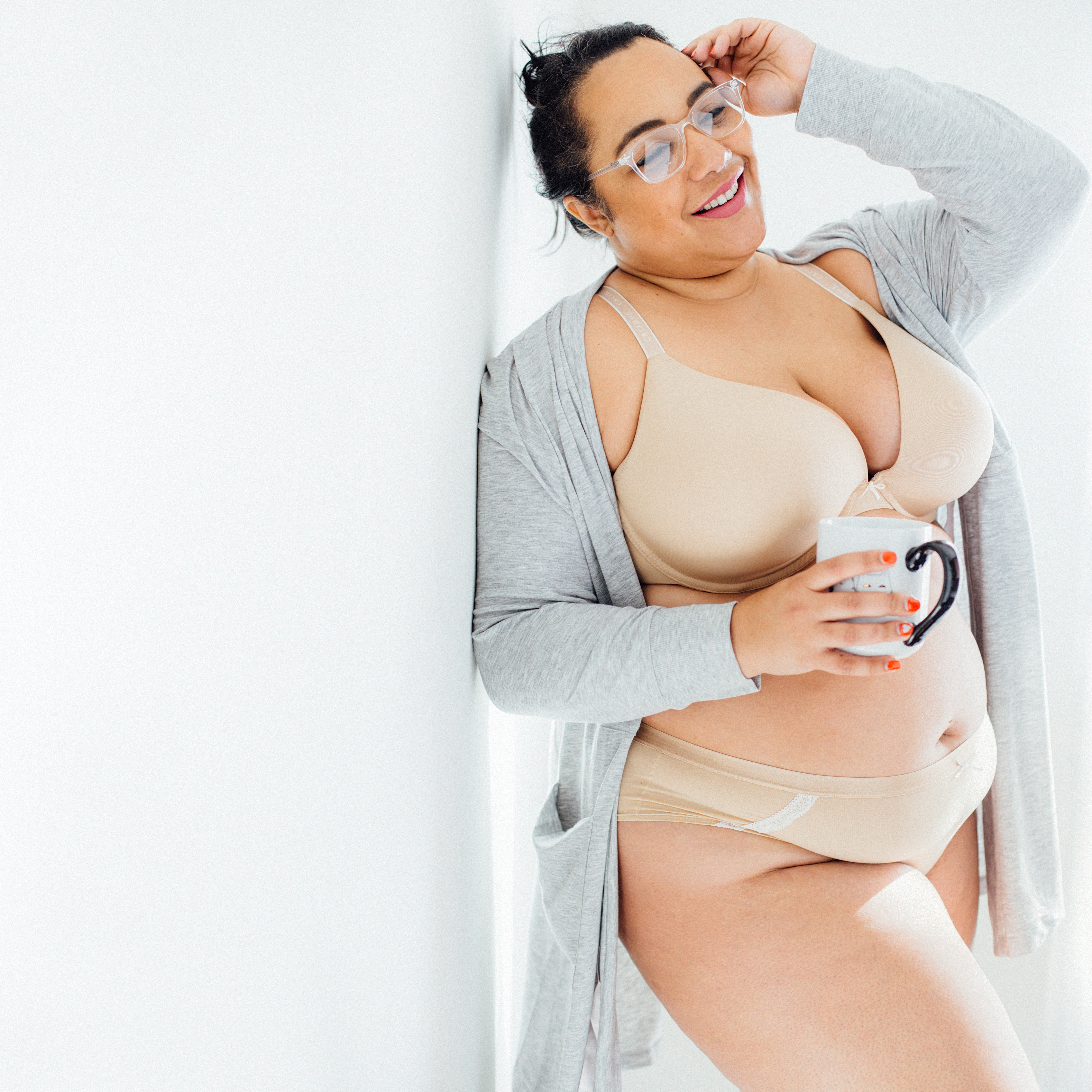 This bra is perfect for low-cut tops and dresses or for lounging around while looking as sexy as can be! (If you’re wanting more coverage, they also sell a lightly lined t-shirt bra.) Band sizes range from 34-46 and cup sizes range from B-H. Virtually anyone can enjoy the supportive, sexy comfort this bra provides!