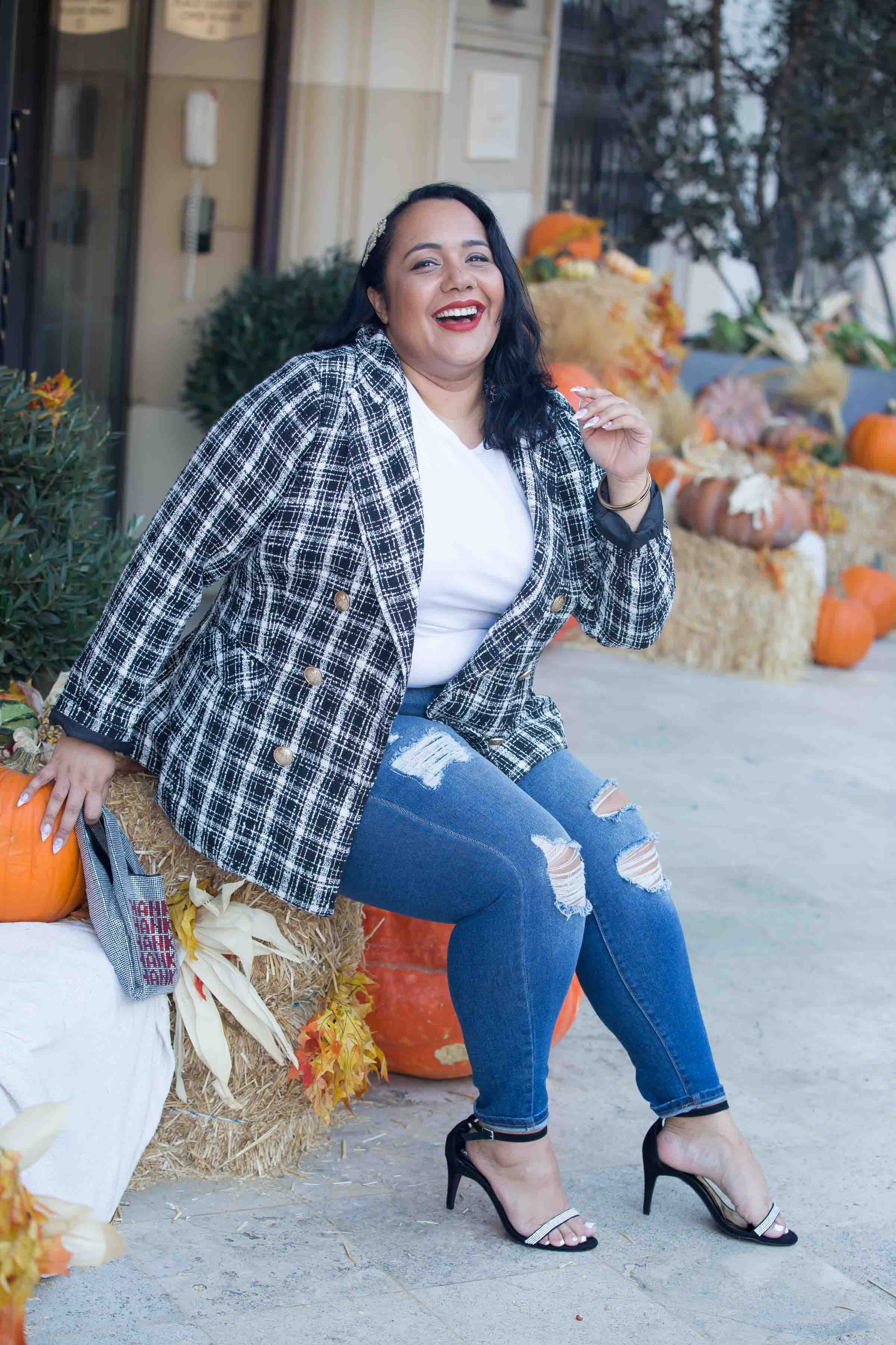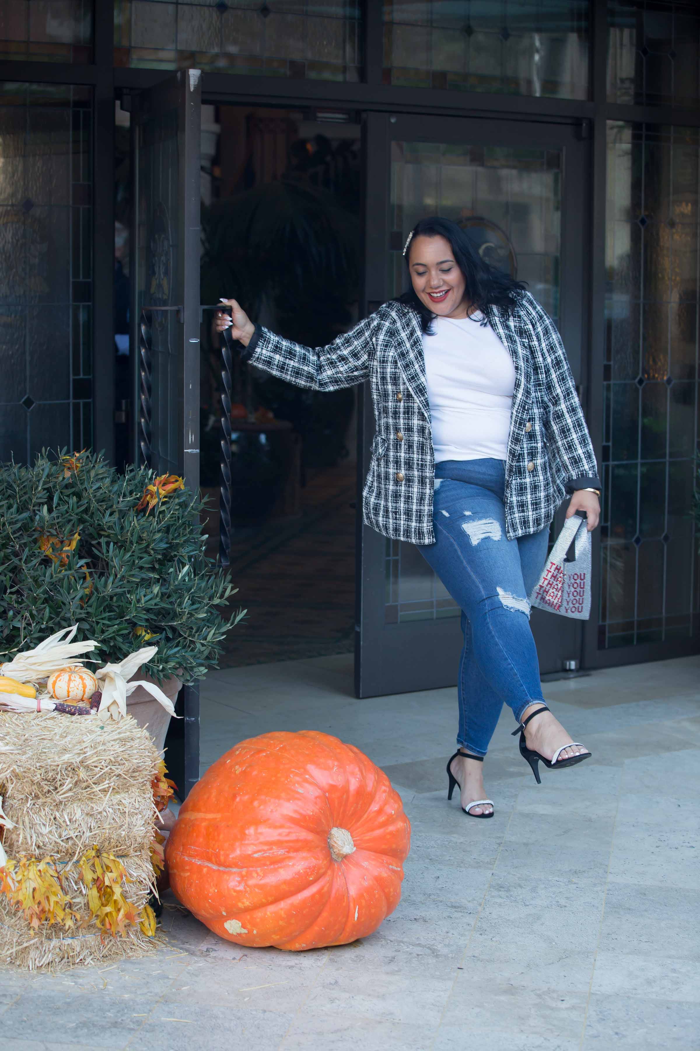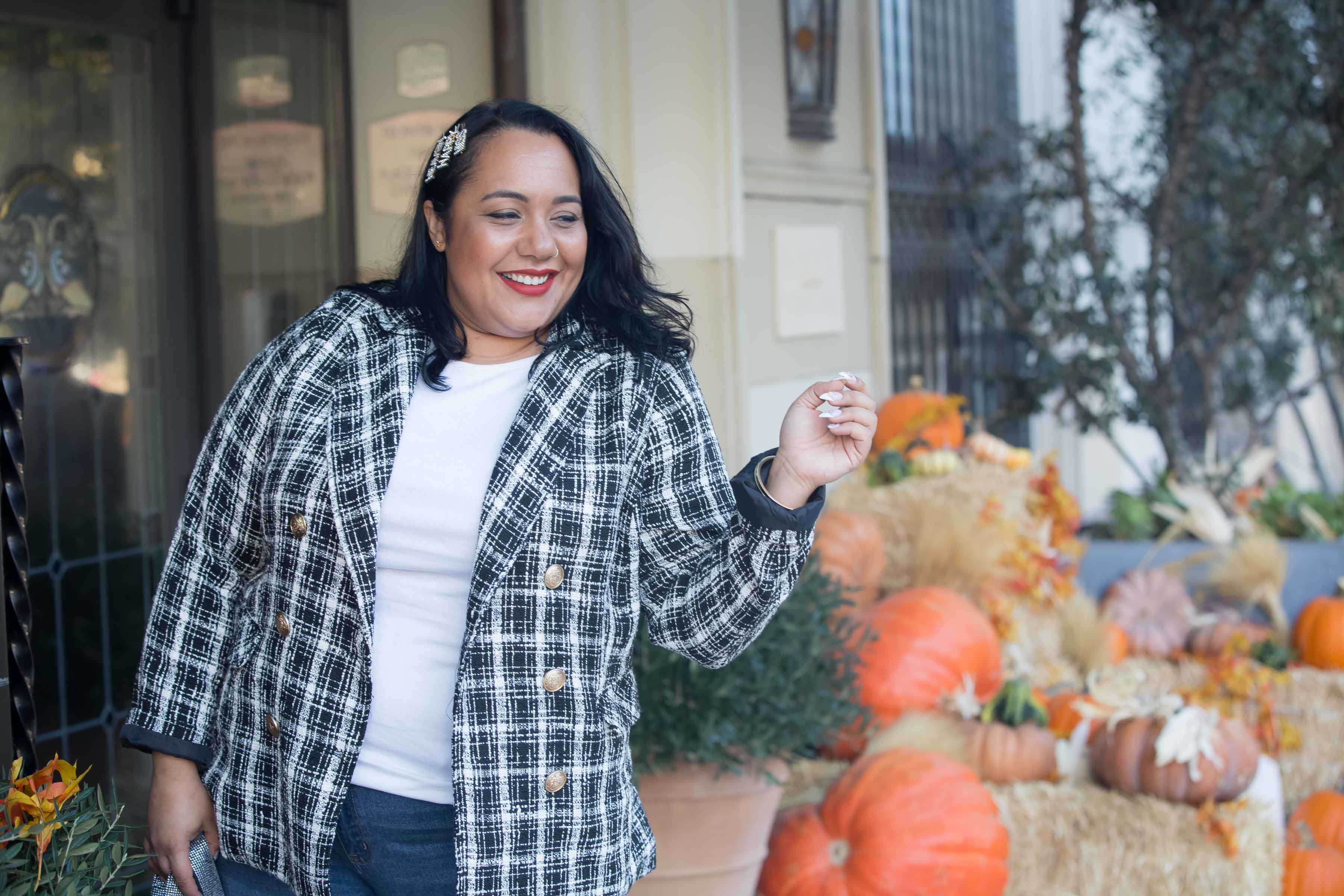 If I were to style this fab blazer differently, I might wear black faux leather leggings and a band t-shirt or drape it over my shoulders like a cape. I love preppy chic vibes during the Fall. And, doing a little pattern mixing, to give this blazer some vintage vibes would be fantastic too!