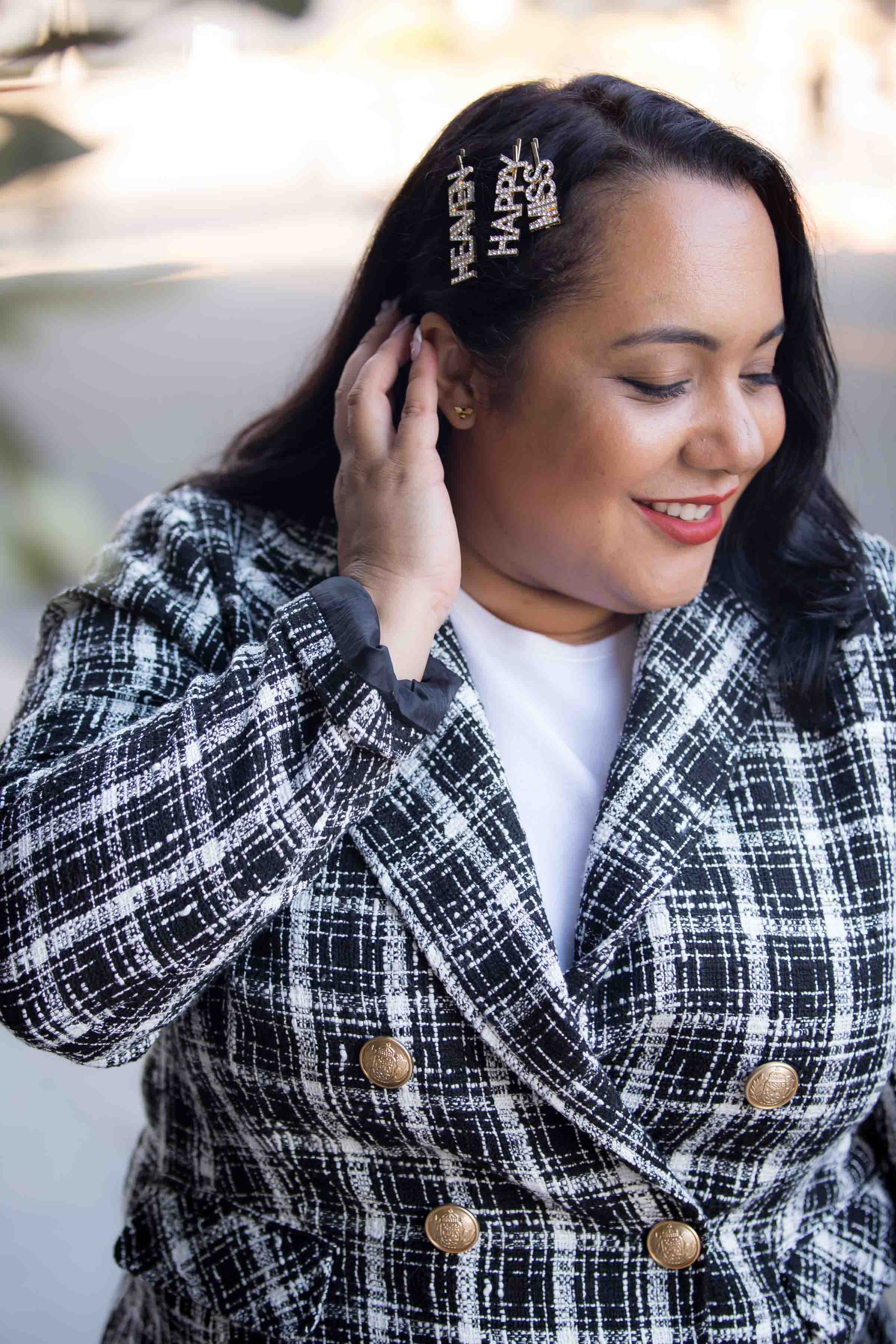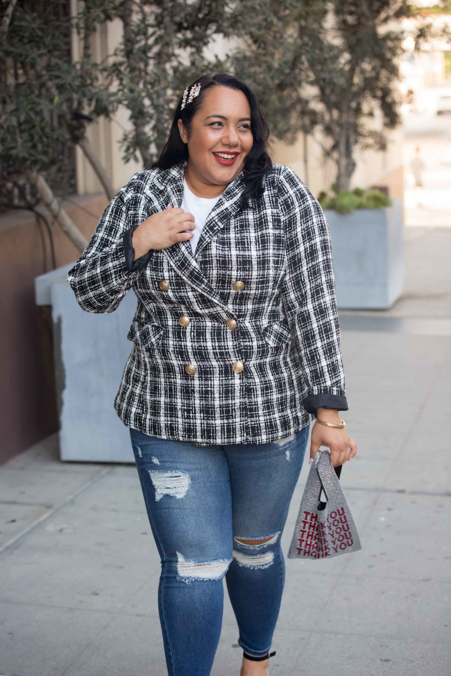 Blazers can be dressed up, dressed down or paired with any number of pieces: pants/jeans, leggings, dresses, skirts, jumpsuits…the list goes on and on. This double-breasted tweed blazer is my new favorite staple piece! The gold buttons are such a cute accent and combined with the quality fabric and tailored-like fit, make for it a very luxe wardrobe staple.