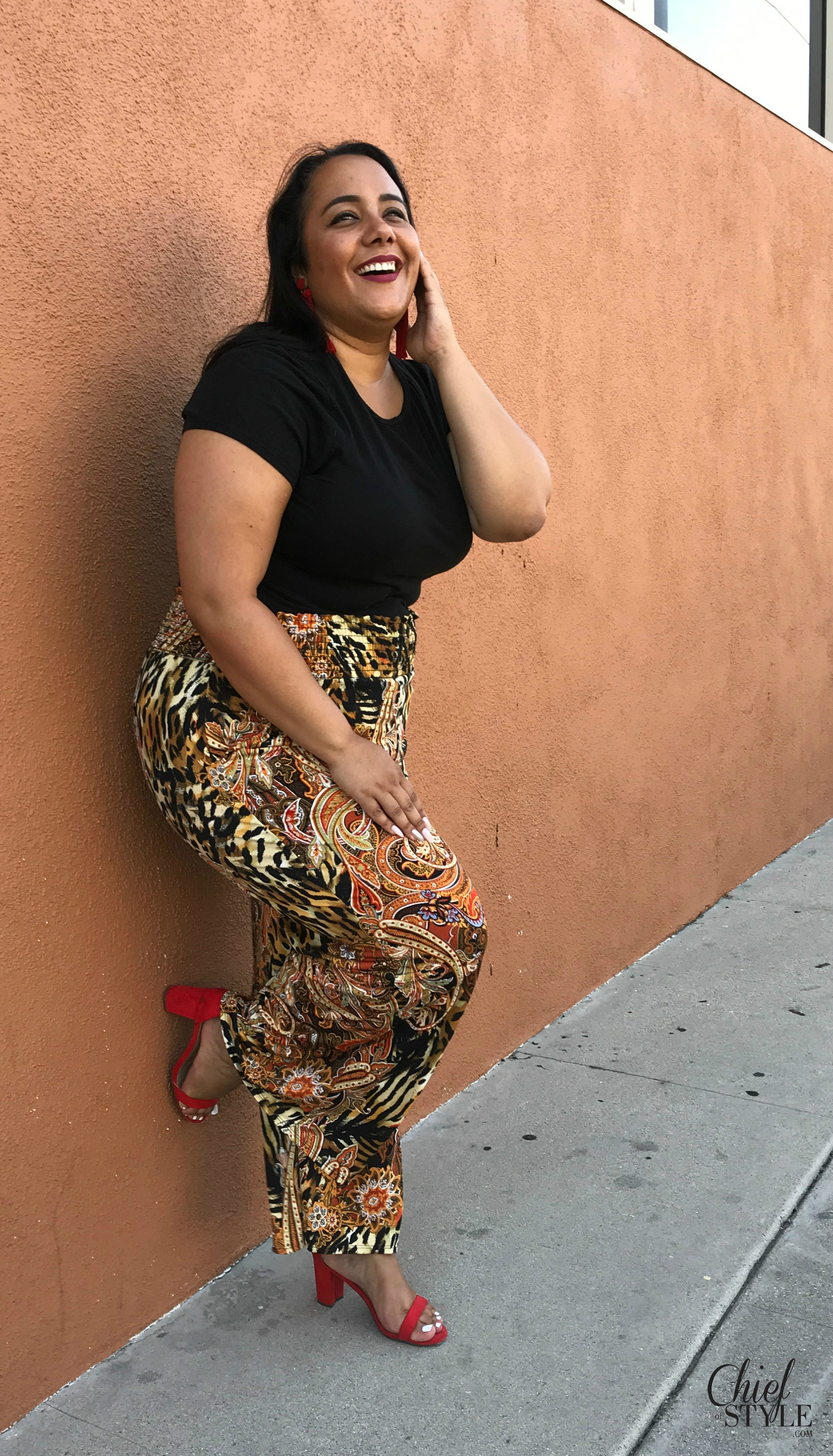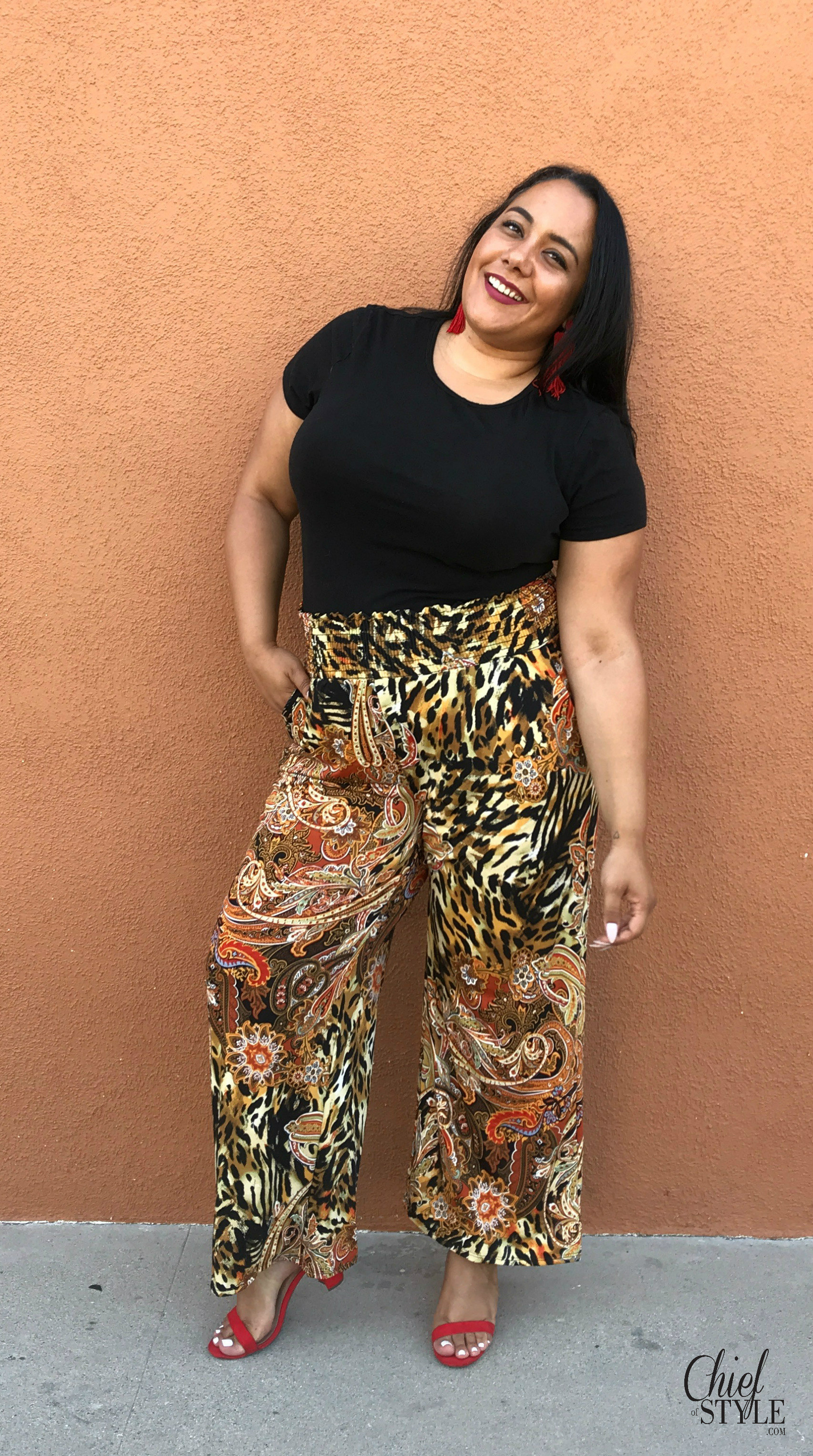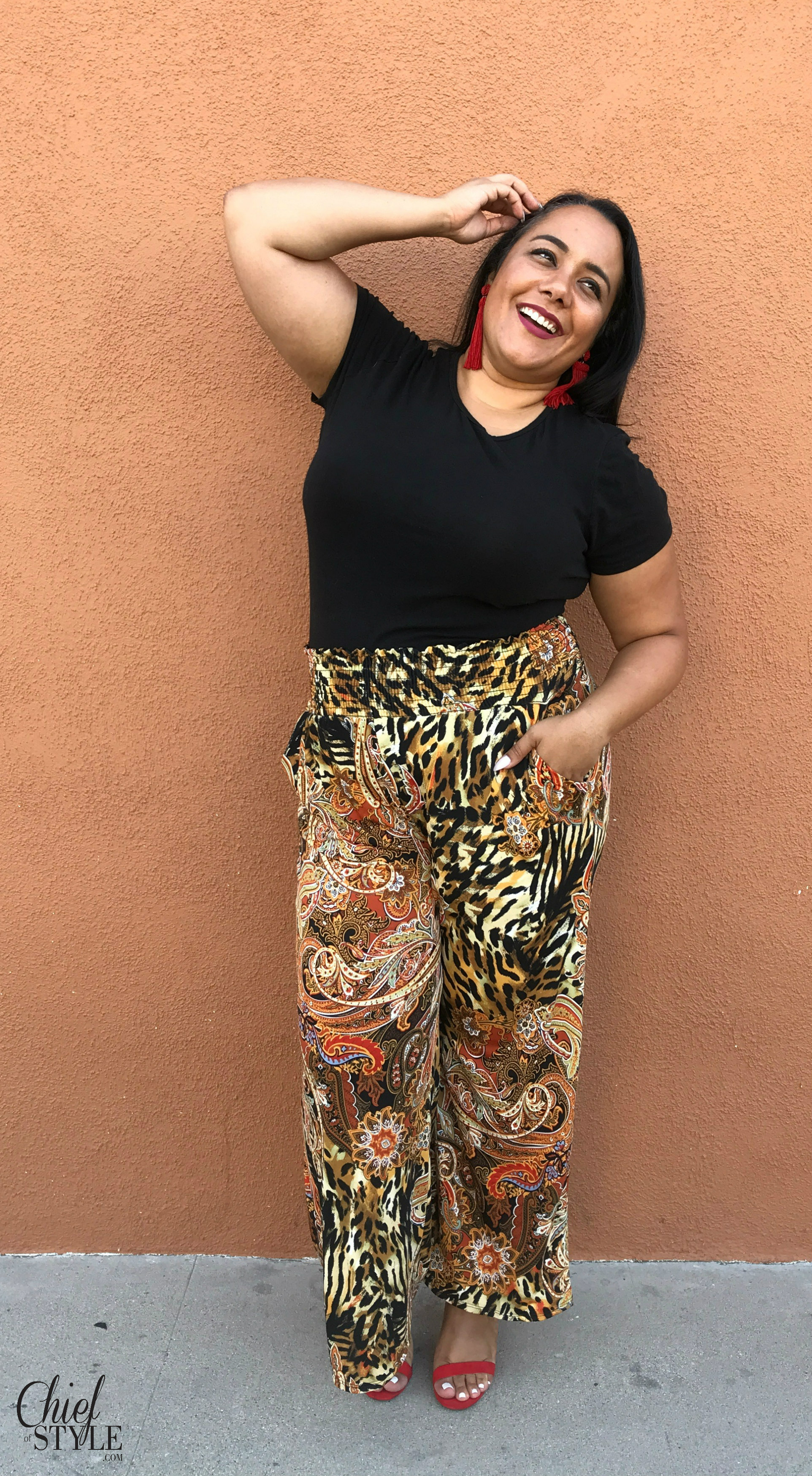 I fell in love with these paisley and animal print pants because of the pattern, but also the fabric and the wide waistband. They’re really stretchy and comfortable. Best of all, the look is perfectly on trend for the upcoming Fall season. Anyone who knows me can tell you I love a loud, standout pattern and this is definitely that!