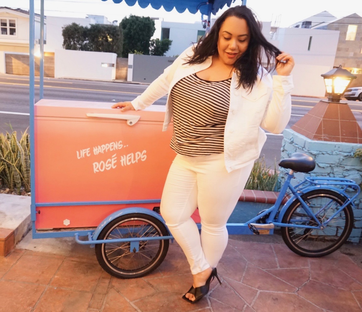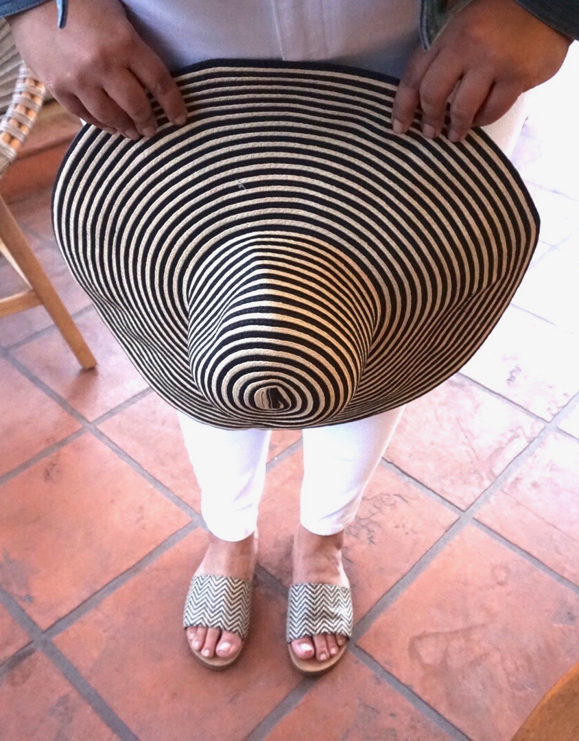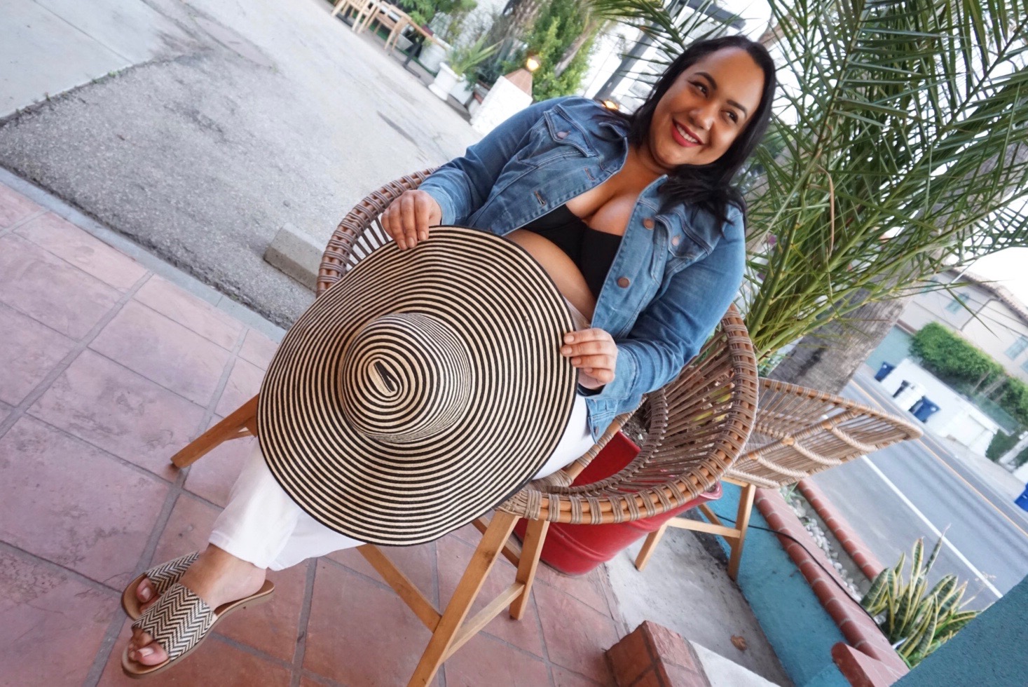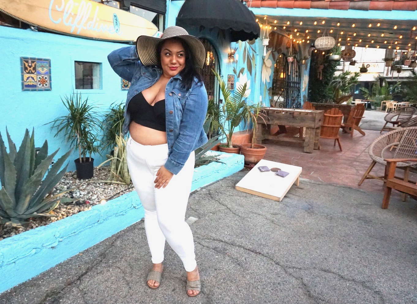 Here I’m wearing a full LB look: medium wash denim jacket, longline bikini top, crisp white skinny jeans, woven slide sandals and a woven floppy hat. I actually loved the denim jacket so much, I had to get it in white, too!